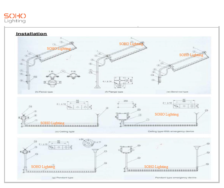 Đèn Chống nổ lắp bóng tube được ứng dụng lắp đặt ở nhiều vị trí theo bảng hướng dẫn phương pháp lắp như sau: