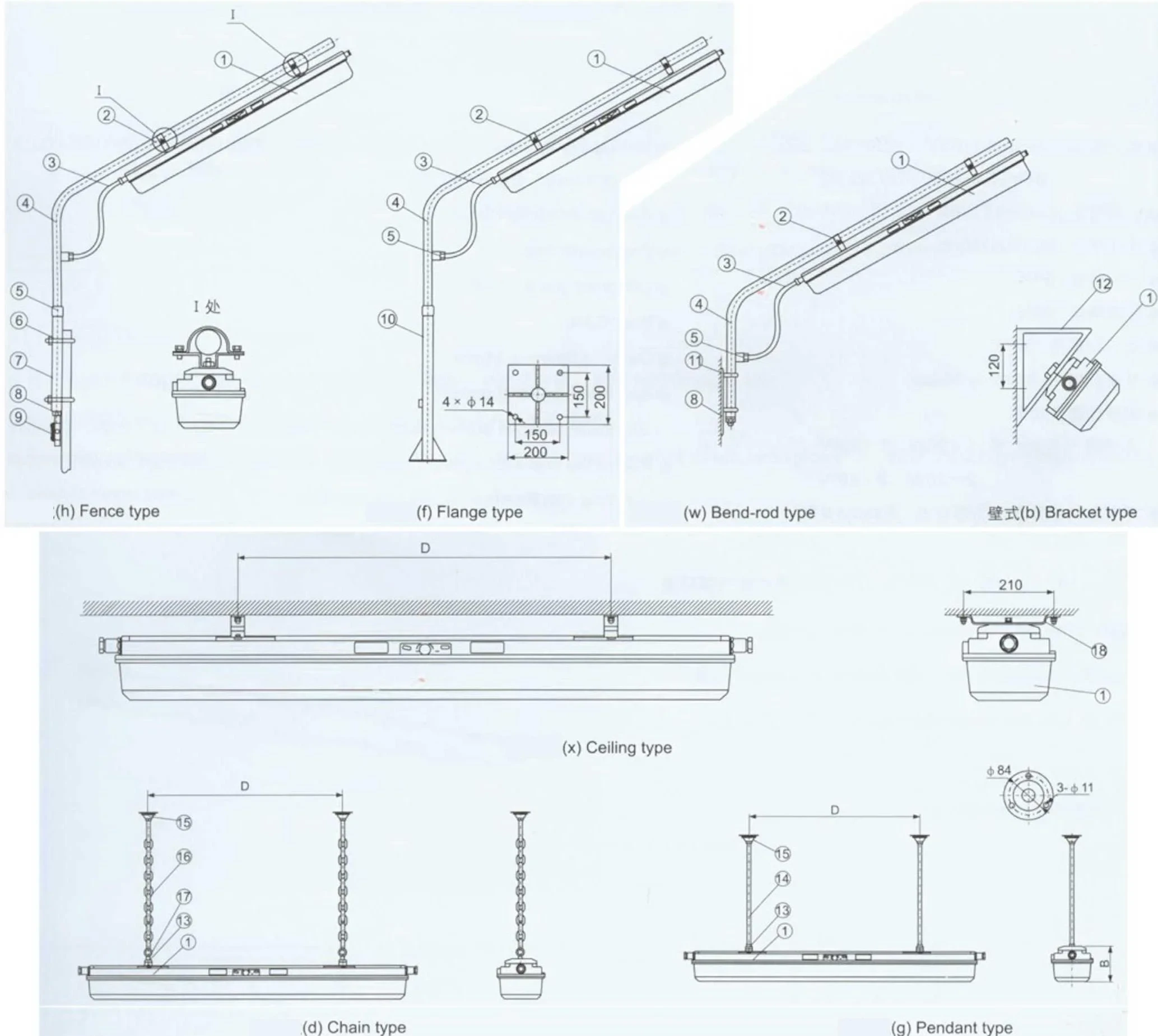 Đèn Chống nổ lắp bóng tube được ứng dụng lắp đặt ở nhiều vị trí theo bảng hướng dẫn phương pháp lắp như sau: